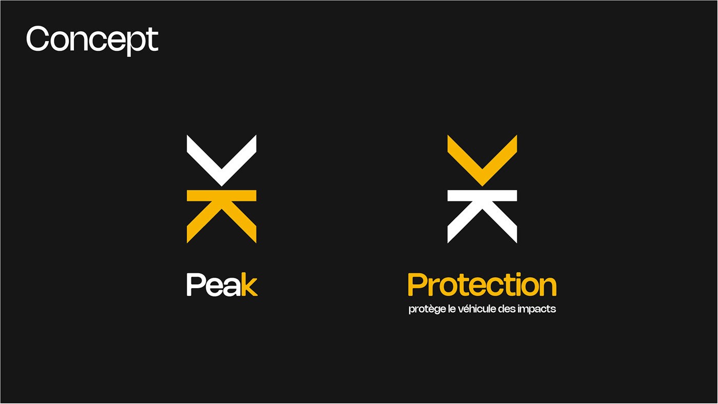 Branding complet pour Peak Protection (Pare-pierre, Wrap & Lettrage). Une identité visuelle "High-Contrast" (Noir & Jaune) bâtie autour d'un monogramme en forme de bouclier. L'image de la protection automobile haut de gamme.