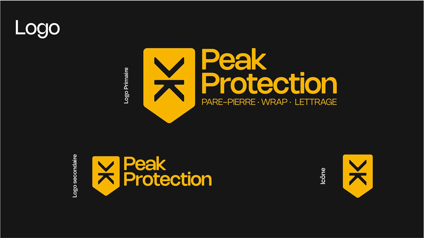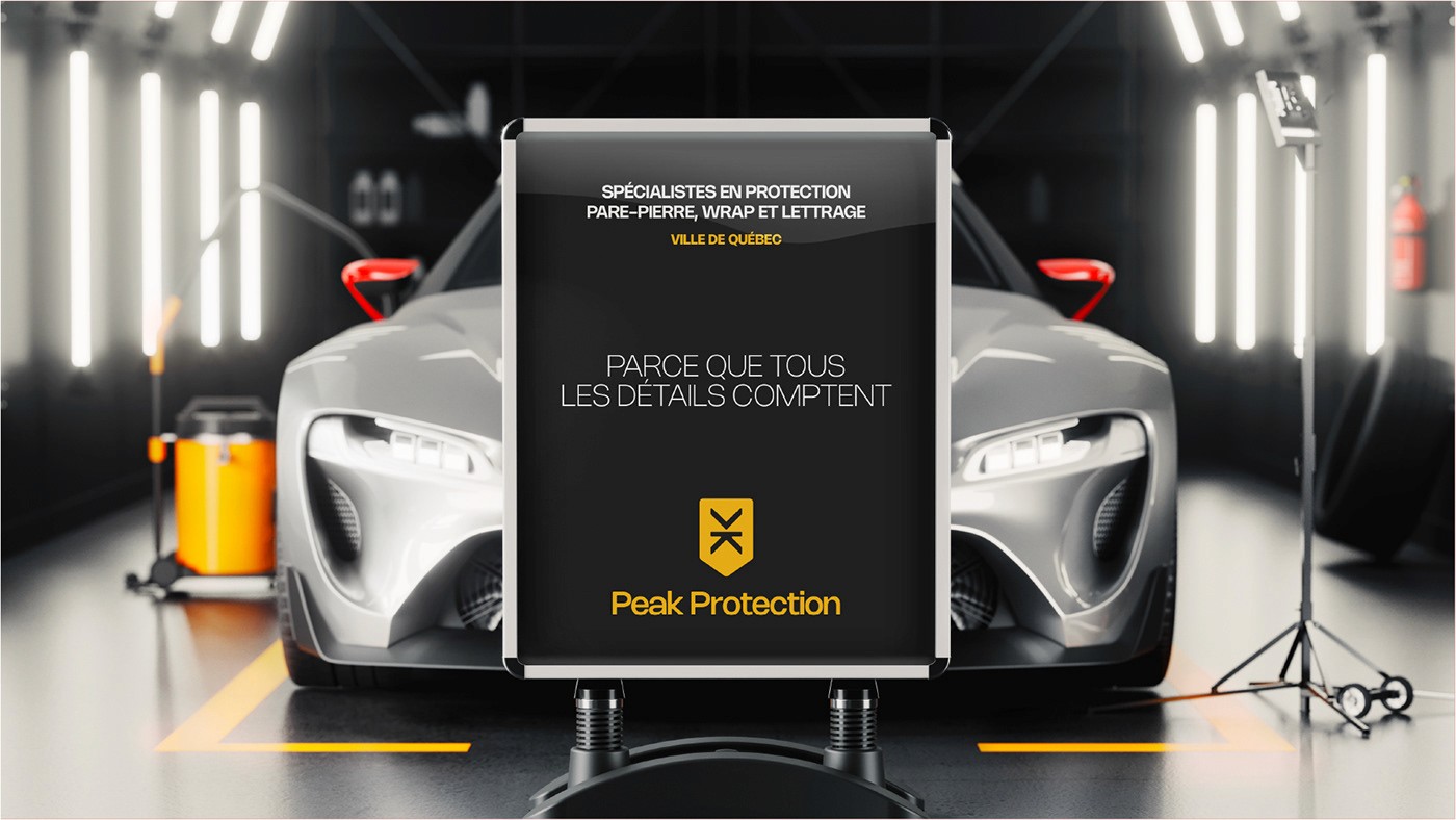 Une marque qui ne s'excuse pas. Le logo fonctionne aussi bien en miniature sur une carte d'affaires qu'en format géant sur une porte de garage. L'identité positionne immédiatement Peak Protection comme un "spécialiste" technique plutôt que comme un simple applicateur. "Parce que tous les détails comptent", ce n'est pas juste un slogan, c'est ce que l'identité visuelle crie haut et fort.